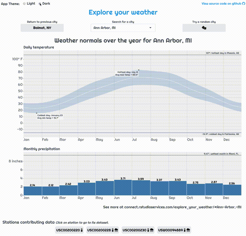 If you read the companion article to this on using caching in our app, you know the main plot is cached. We need to add the current theme to the cache key; otherwise, a plot for a city originally rendered in light mode may be given even though the current viewer is in dark mode. To do this, we can add info on the plot’s style, provided by getCurrentOutputInfo()$fg() to the cache key.