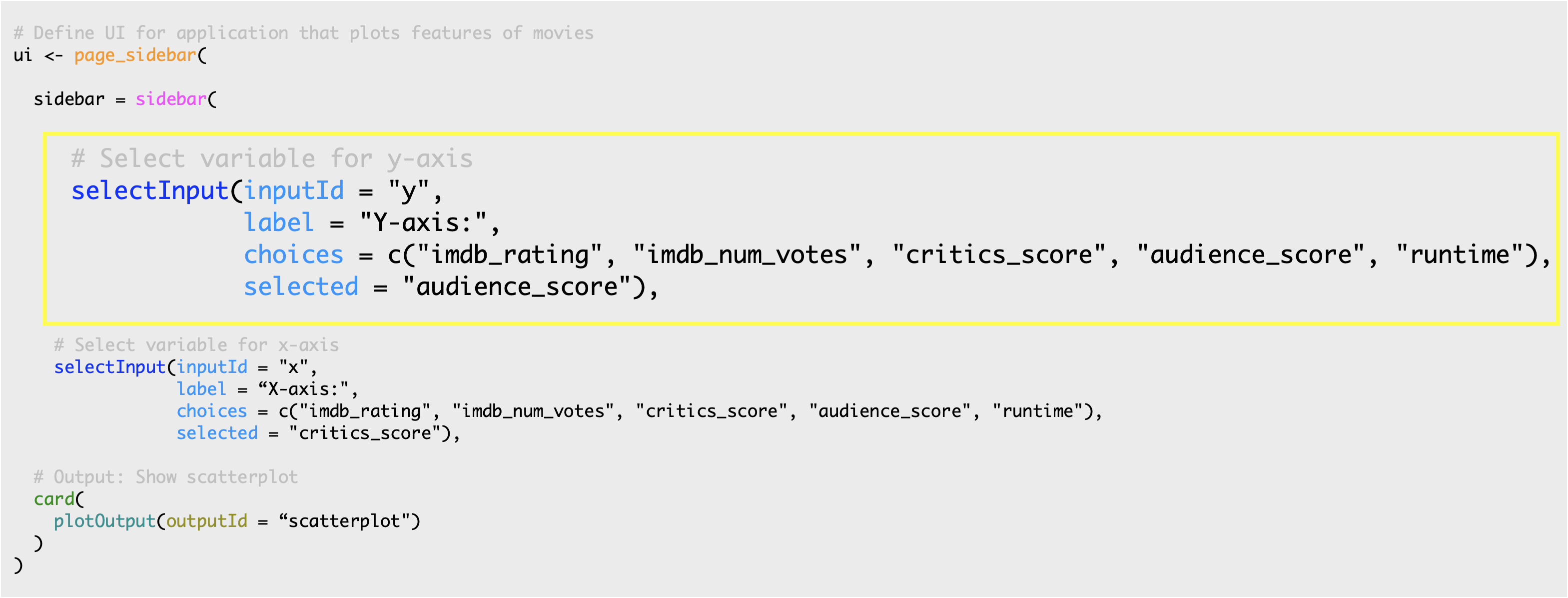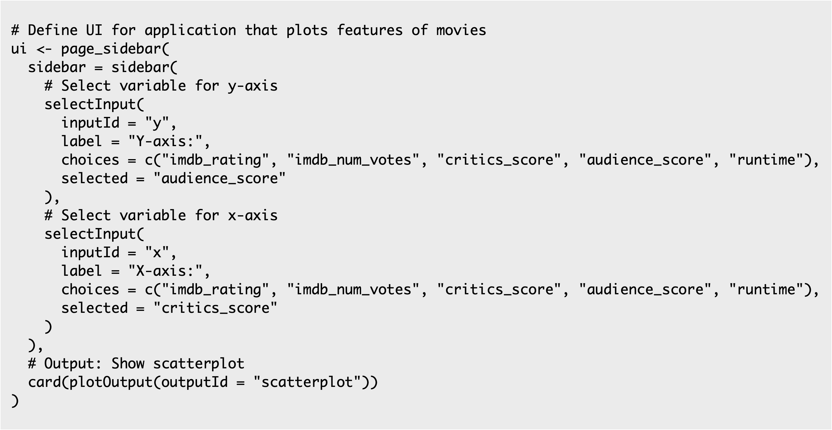 3. The third argument is the list of choices the user will choose from. In this app, these are variable names from the movies dataset.