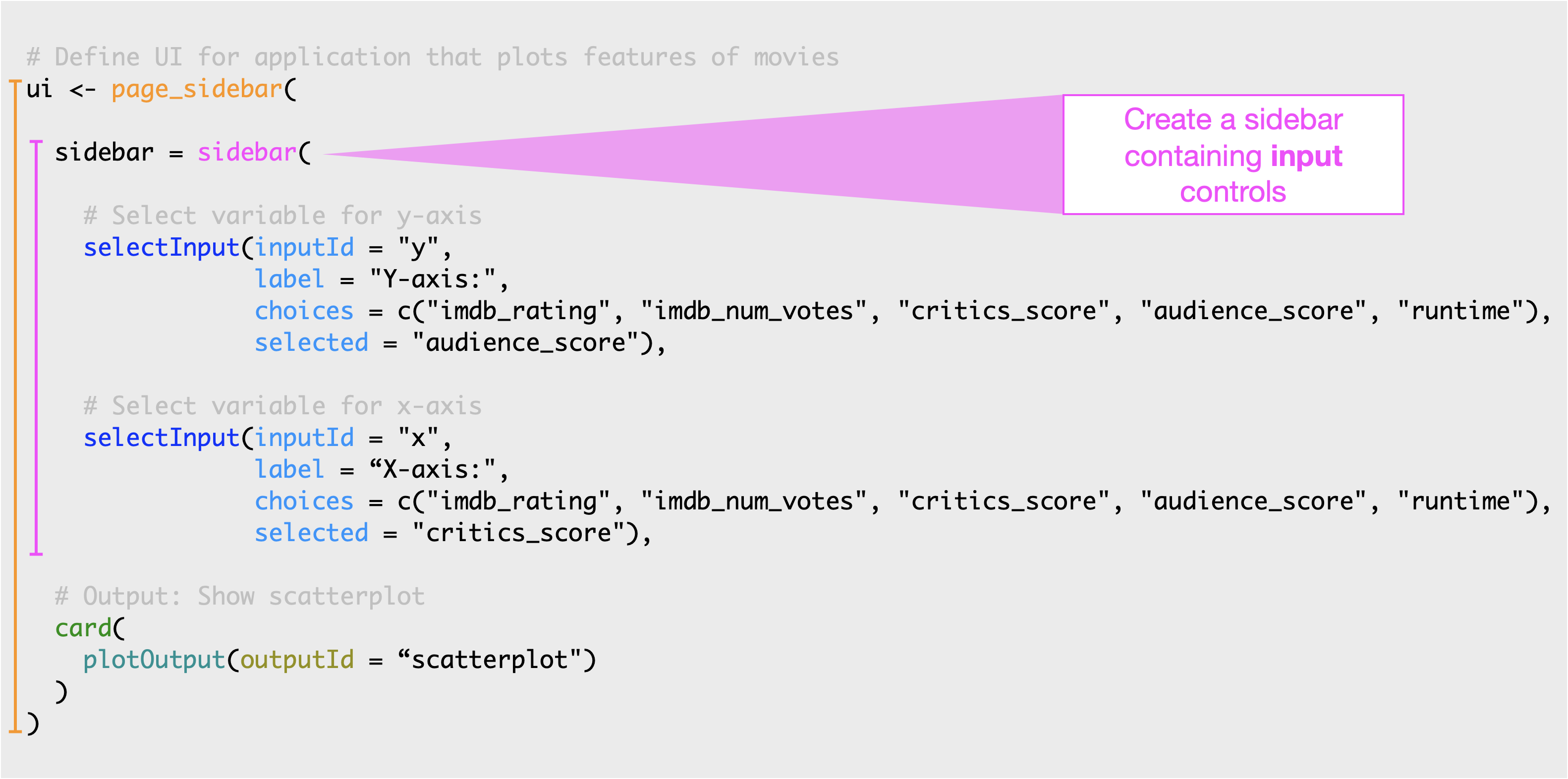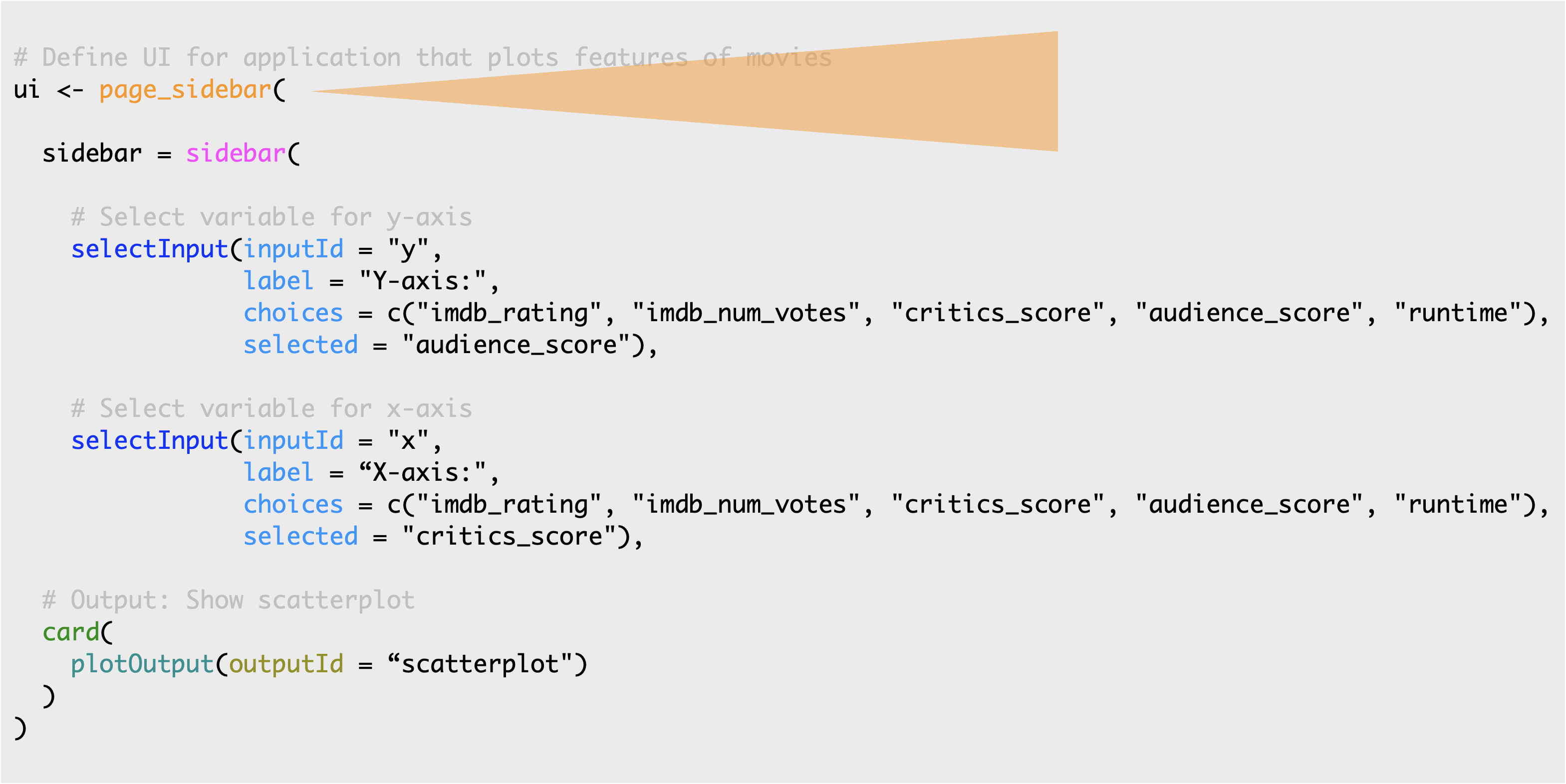 Arrow pointing to the line of code in the Shiny app that says 'sidebar{' and says Create a sidebar panel containing Input controls.