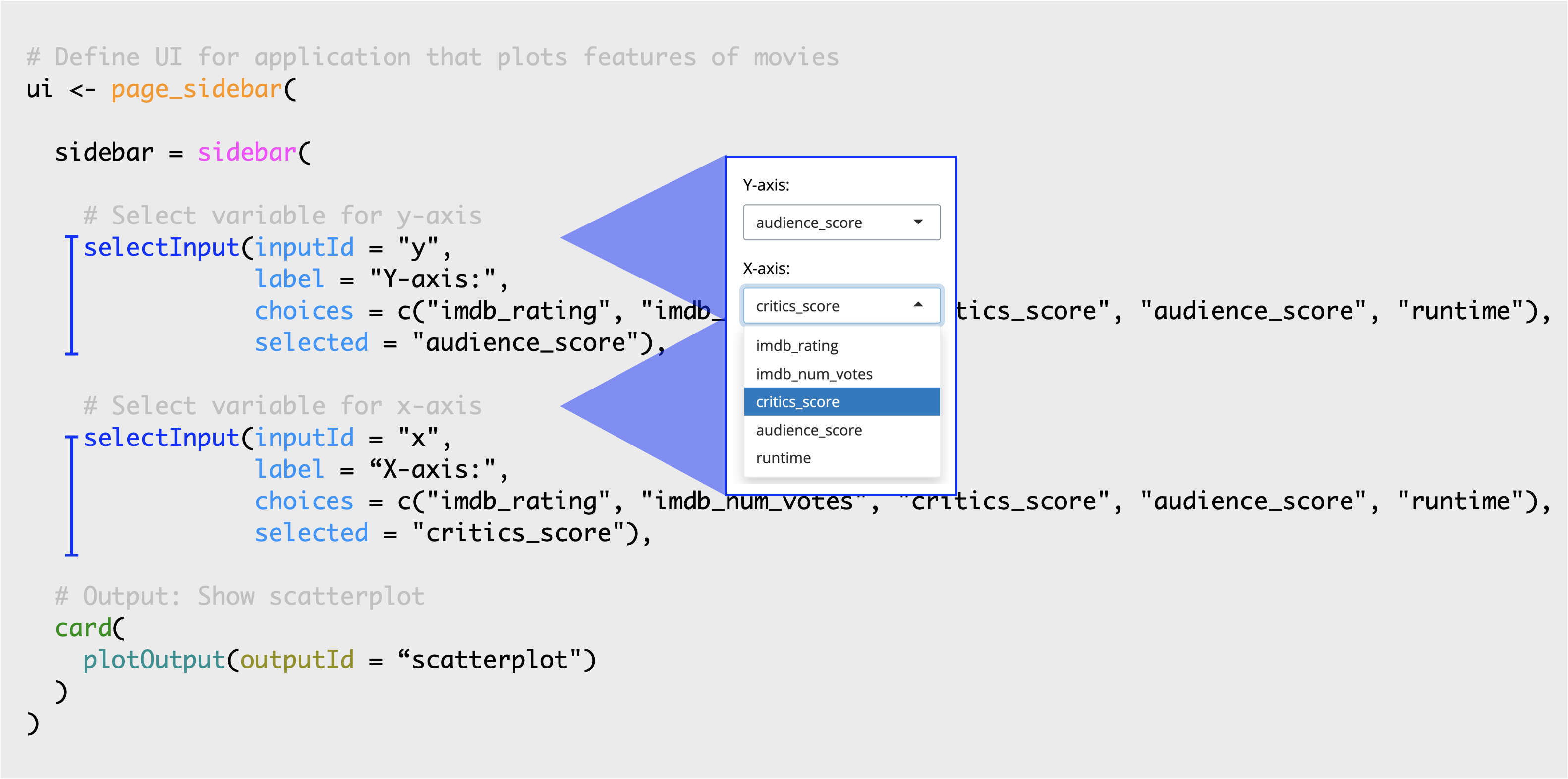Arrows pointing to the sections of code in the Shiny app that say 'selection{inputId = 'y', label = 'Y-axis:',' and 'selection{inputId = 'x', label = 'X-axis:',' and shows those sections in the app from the sidebar panel.