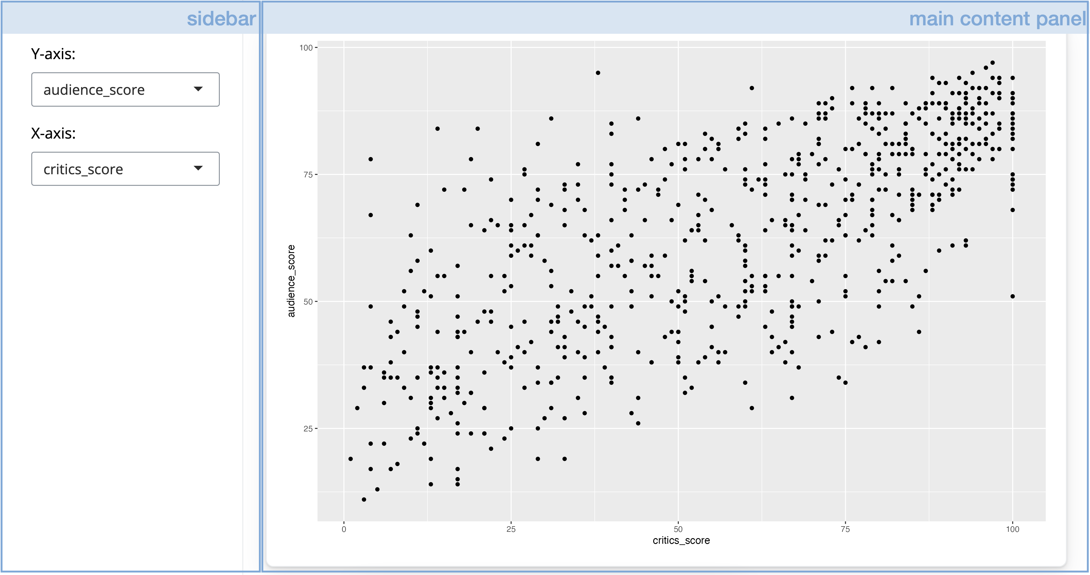 Our same Shiny app. Shiny app with Y-axis of audience_score and X-axis of critics_score. Those variables are in a box on the left. On the right is a scatterplot of the data. Points cover the whole plot, but have a general linear upward trend with a slope of 1.