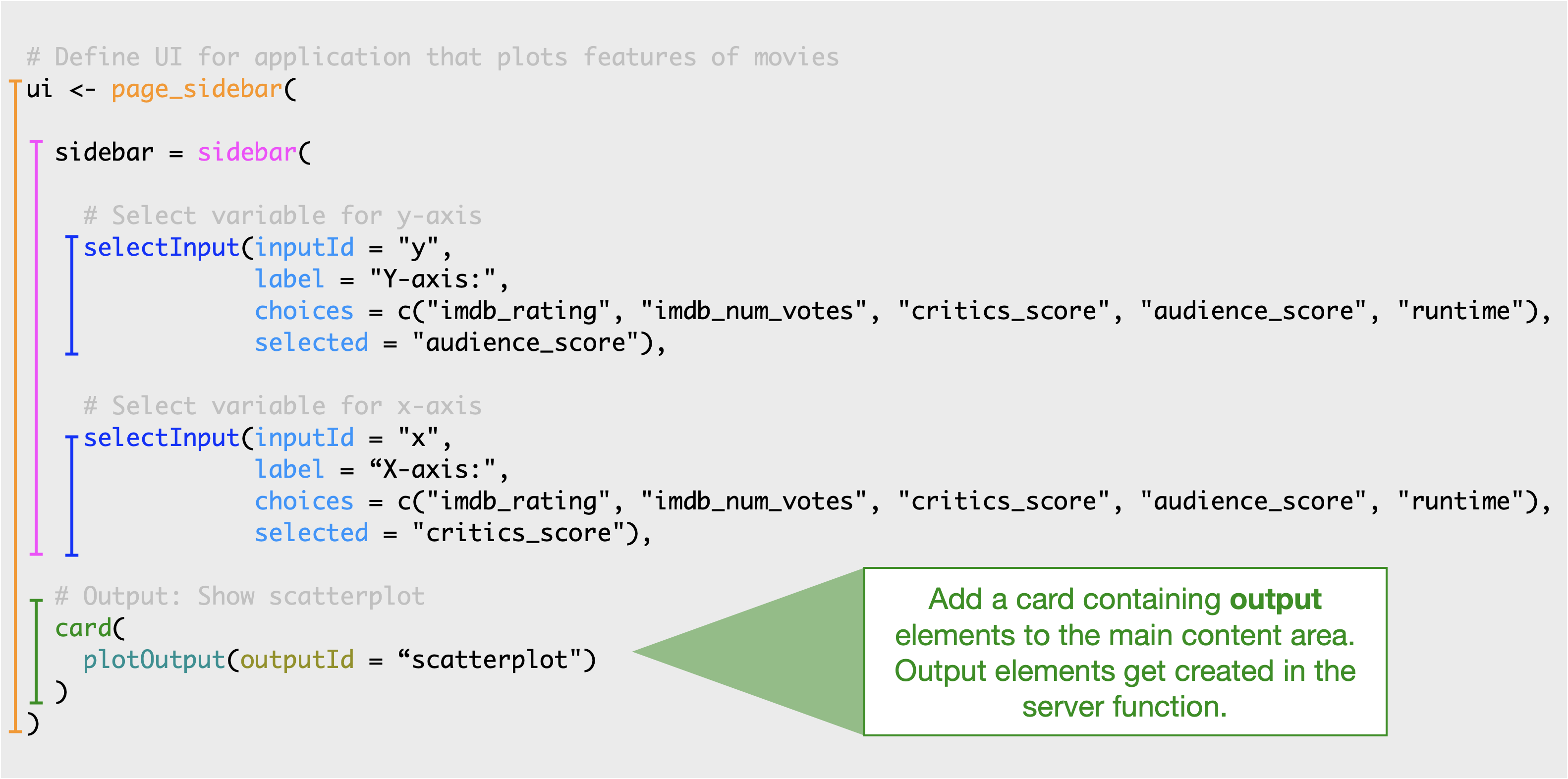 The final component of our UI is the main content area. Add elements to the main content area by passing additional UI elements to page_sidebar().