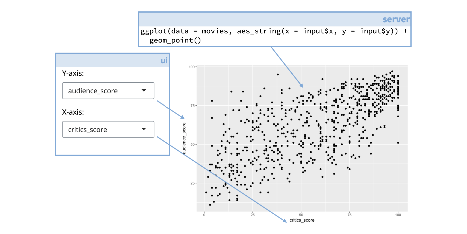 Highlighting areas of the Shiny app. Shows the Y-axis box pointing to the y-axis on the plot and the X-axis box pointing to the x-axis on the plot. Code 'ggplot(data = movies, aes_string(x = input$x, y = input$y)) + geom_point()' points to the points on the scatterplot.