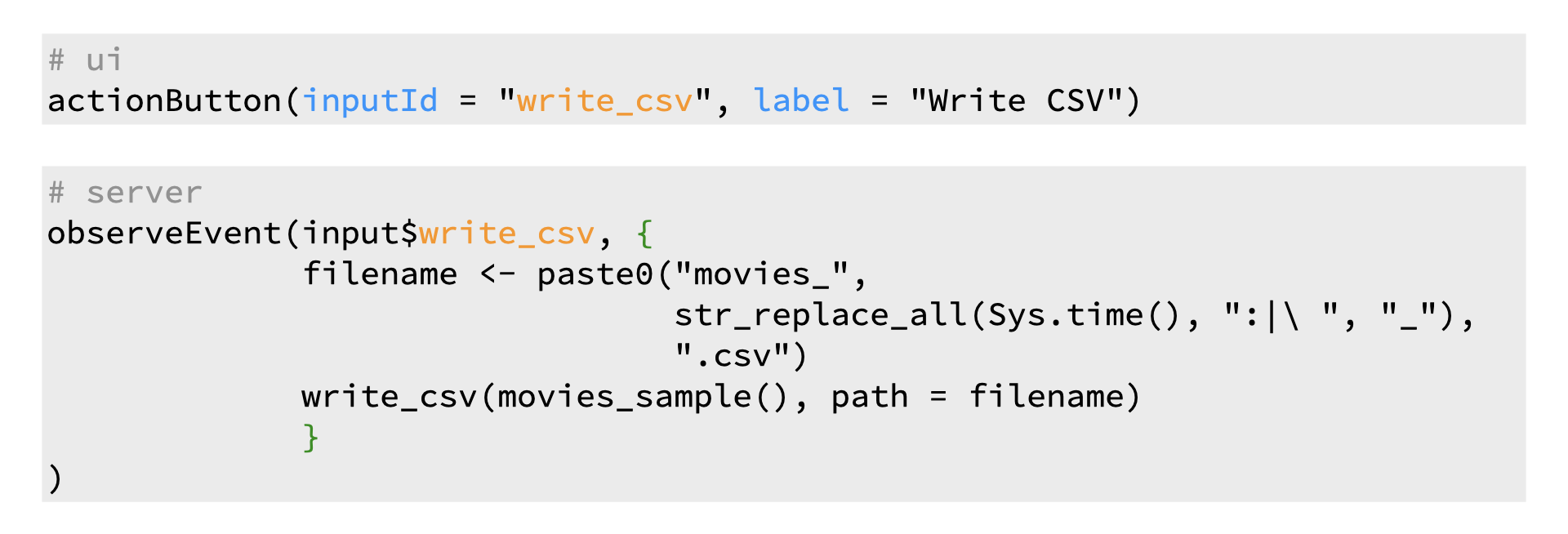 • And in the server, we condition the observeEvent() on the inputId of that action button. This way R knows to call the expression given in the second argument of observeEvent() when the user presses the action button.