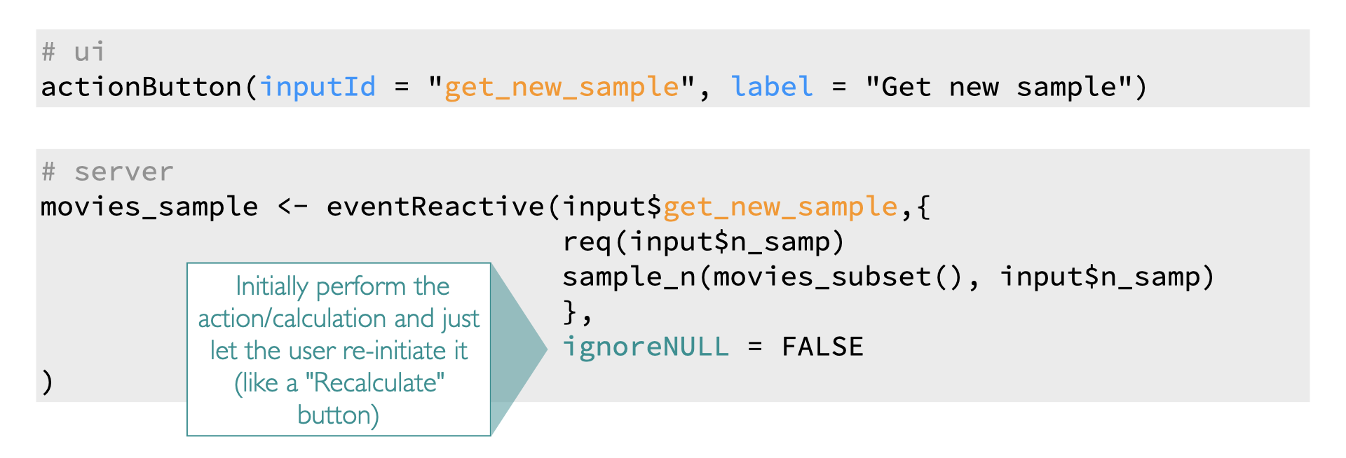 Suppose your goal is to change how users take random samples in your app – you only want them to get a new sample when an action button that says “get new sample” is pressed, not when other things like a numeric input defining the size of the sample changes.