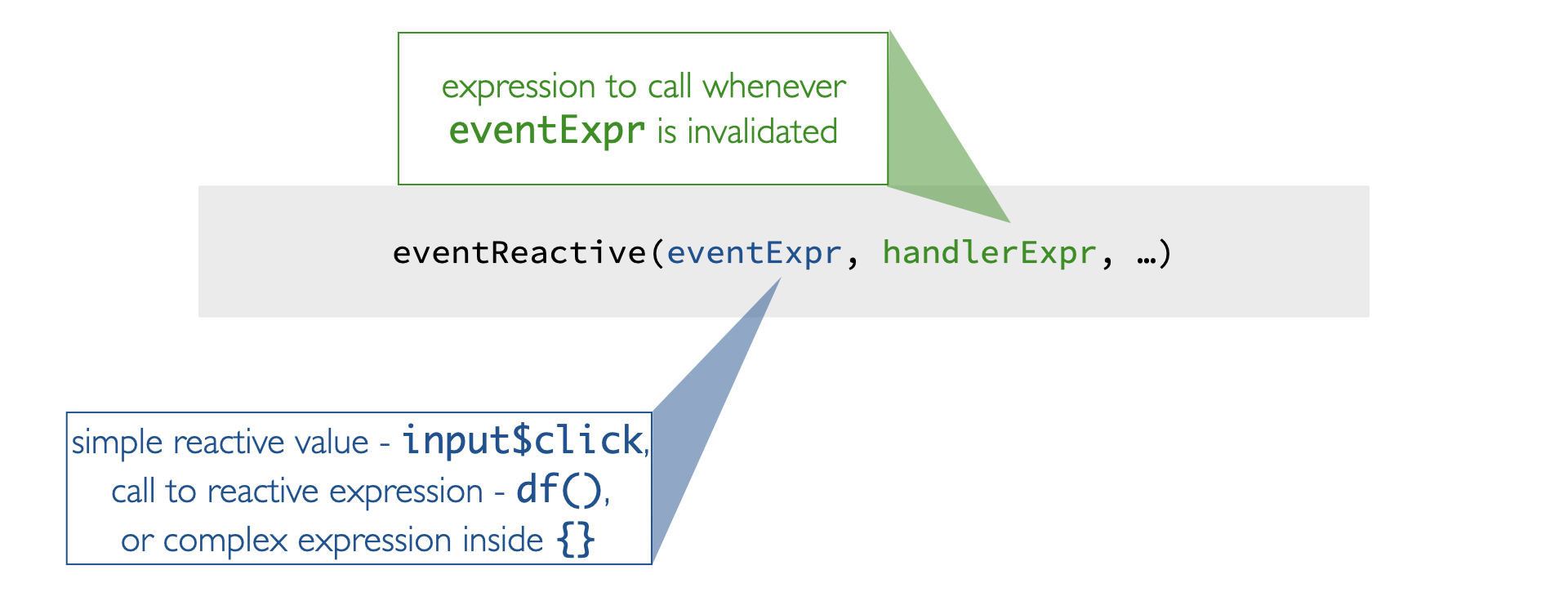 Code line 'eventReactive(eventExpr, handlerExpr, ...)'. 'eventExpr' is described as 'simple reactive value - input$click, call to reactive expression - df(), or complex expression inside {}'. 'handlerExpr' is described as 'expression to call whenever eventExpr is invalidated'.
