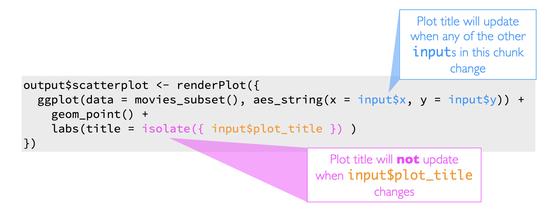 Section of the code with 'output$scatterplot <- renderPlot'. 'input$x' is highlighted with a description of Plot title will update when any of the other inputs in this chunk change. 'isolate({input$plot_title})' is highlighed with the description Plot title will not update when input$plot_title changes.