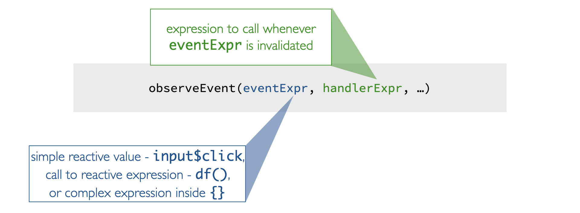 Code line 'observeEvent(eventExpr, handlerExpr, ...)'. 'eventExpr' is described as 'simple reactive value - input$click, call to reactive expression - df(), or complex expression inside {}'. 'handlerExpr' is described as 'expression to call whenever eventExpr is invalidated'.